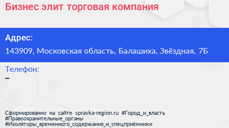 Бизнес-элит, торговая компания по адресу 143909, Московская область, Балашиха, Звёздная, 7Б в дальнейшем Организация, размещена в следующих категориях: