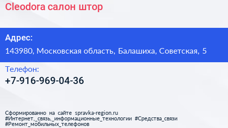 Cleodora, салон штор по адресу 143980, Московская область, Балашиха, Советская, 5 в дальнейшем Организация, размещена в следующих категориях: