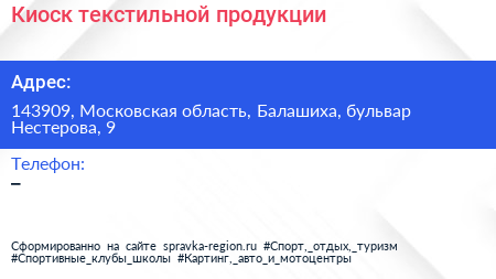 Киоск текстильной продукции по адресу 143909, Московская область, Балашиха, бульвар Нестерова, 9 в дальнейшем Организация, размещена в следующих категориях:
