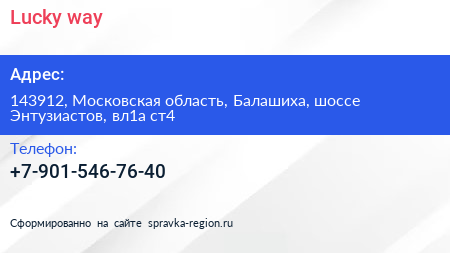 Lucky way по адресу 143912, Московская область, Балашиха, шоссе Энтузиастов, вл1а ст4 в дальнейшем Организация, размещена в следующих категориях: