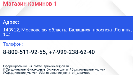 Магазин каминов №1 по адресу 143912, Московская область, Балашиха, проспект Ленина, 10а в дальнейшем Организация, размещена в следующих категориях: