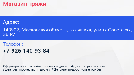 Магазин пряжи по адресу 143902, Московская область, Балашиха, улица Советская, 36 к7 в дальнейшем Организация, размещена в следующих категориях: