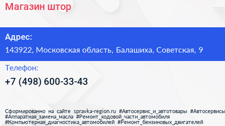 Магазин штор по адресу 143922, Московская область, Балашиха, Советская, 9 в дальнейшем Организация, размещена в следующих категориях: