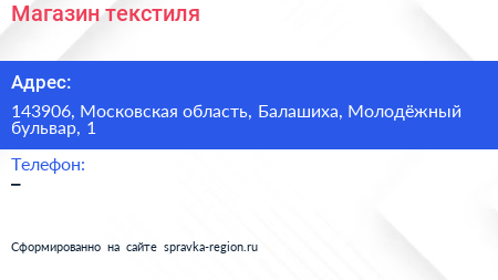 Магазин текстиля по адресу 143906, Московская область, Балашиха, Молодёжный бульвар, 1 в дальнейшем Организация, размещена в следующих категориях: