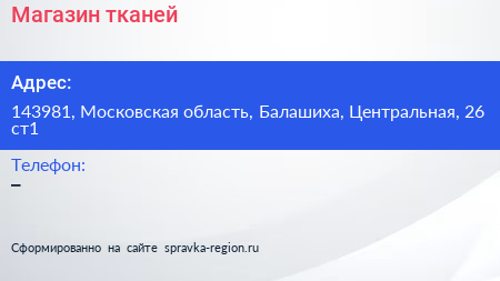 Магазин тканей по адресу 143981, Московская область, Балашиха, Центральная, 26 ст1 в дальнейшем Организация, размещена в следующих категориях: