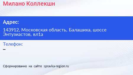 Милано Коллекшн по адресу 143912, Московская область, Балашиха, шоссе Энтузиастов, вл1а в дальнейшем Организация, размещена в следующих категориях: