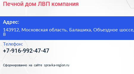 Печной дом ЛВП, компания по адресу 143912, Московская область, Балашиха, Объездное шоссе, 8 в дальнейшем Организация, размещена в следующих категориях: