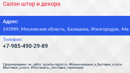 Салон штор и декора по адресу 143989, Московская область, Балашиха, Жилгородок, 44а в дальнейшем Организация, размещена в следующих категориях: