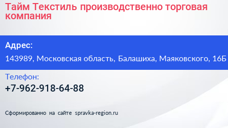 Тайм Текстиль, производственно-торговая компания по адресу 143989, Московская область, Балашиха, Маяковского, 16Б в дальнейшем Организация, размещена в следующих категориях: