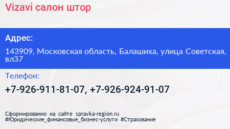 Vizavi, салон штор по адресу 143909, Московская область, Балашиха, улица Советская, вл37 в дальнейшем Организация, размещена в следующих категориях: