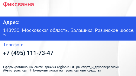 Фиксванна по адресу 143930, Московская область, Балашиха, Разинское шоссе, 5 в дальнейшем Организация, размещена в следующих категориях: