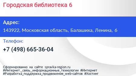 Городская библиотека №6 по адресу 143922, Московская область, Балашиха, Ленина, 6 в дальнейшем Организация, размещена в следующих категориях:
