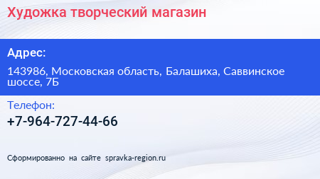 Художка, творческий магазин по адресу 143986, Московская область, Балашиха, Саввинское шоссе, 7Б в дальнейшем Организация, размещена в следующих категориях: