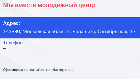 Мы вместе, молодежный центр по адресу 143980, Московская область, Балашиха, Октябрьская, 17 в дальнейшем Организация, размещена в следующих категориях: