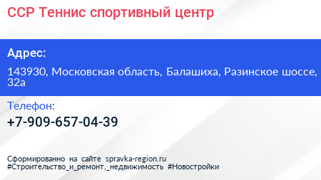 ССР-Теннис, спортивный центр по адресу 143930, Московская область, Балашиха, Разинское шоссе, 32а в дальнейшем Организация, размещена в следующих категориях: