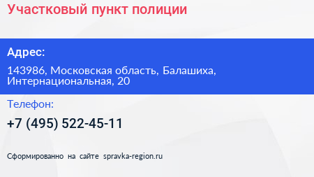 Участковый пункт полиции по адресу 143986, Московская область, Балашиха, Интернациональная, 20 в дальнейшем Организация, размещена в следующих категориях: