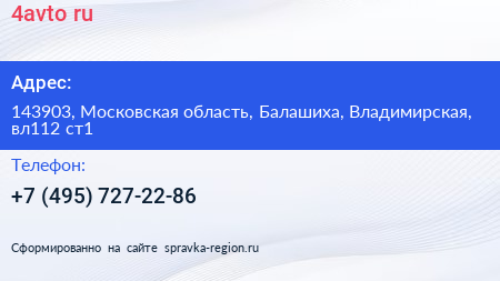4avto.ru по адресу 143903, Московская область, Балашиха, Владимирская, вл112 ст1 в дальнейшем Организация, размещена в следующих категориях:
