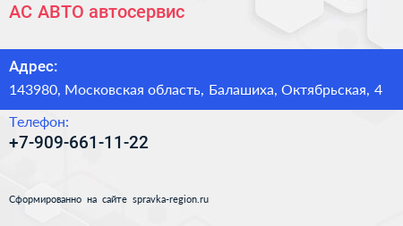 АС-АВТО, автосервис по адресу 143980, Московская область, Балашиха, Октябрьская, 4 в дальнейшем Организация, размещена в следующих категориях:
