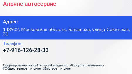 Альянс, автосервис по адресу 143902, Московская область, Балашиха, улица Советская, 31 в дальнейшем Организация, размещена в следующих категориях: