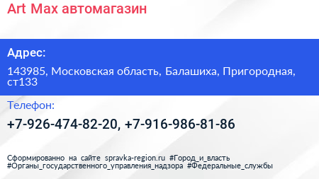 Art & Max, автомагазин по адресу 143985, Московская область, Балашиха, Пригородная, ст133 в дальнейшем Организация, размещена в следующих категориях: