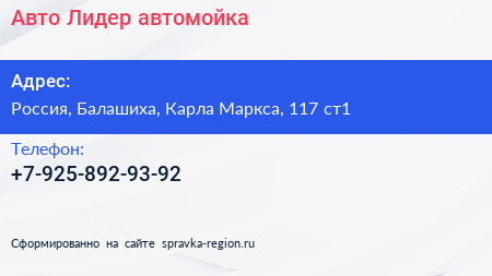 Авто Лидер, автомойка по адресу ВНИИСТРОМ им.Будникова, Коренёвское шоссе, Новокрасково, посёлок КСЗ, Красково, городской округ Люберцы, Московская область, Центральный федеральный округ, 140050, Россия в дальнейшем Организация, размещена в следующих категориях: