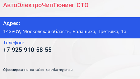 АвтоЭлектроЧипТюнинг, СТО по адресу 143909, Московская область, Балашиха, Третьяка, 1а в дальнейшем Организация, размещена в следующих категориях: