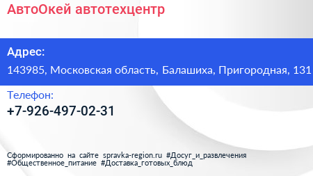 АвтоОкей, автотехцентр по адресу 143985, Московская область, Балашиха, Пригородная, 131 в дальнейшем Организация, размещена в следующих категориях: