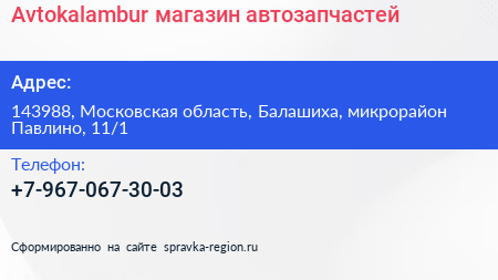 Avtokalambur, магазин автозапчастей по адресу 143988, Московская область, Балашиха, микрорайон Павлино, 11/1 в дальнейшем Организация, размещена в следующих категориях: