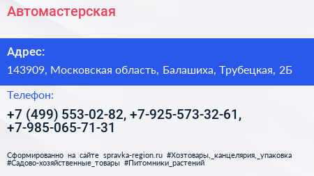 Автомастерская по адресу 143909, Московская область, Балашиха, Трубецкая, 2Б в дальнейшем Организация, размещена в следующих категориях: