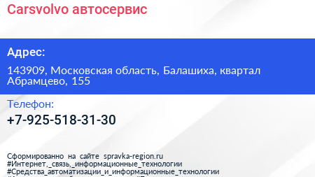 Carsvolvo, автосервис по адресу 143909, Московская область, Балашиха, квартал Абрамцево, 155 в дальнейшем Организация, размещена в следующих категориях: