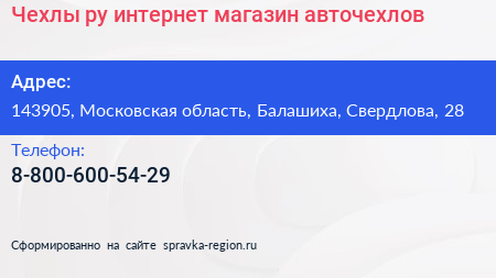 Чехлы.ру, интернет-магазин авточехлов по адресу 143905, Московская область, Балашиха, Свердлова, 28 в дальнейшем Организация, размещена в следующих категориях: