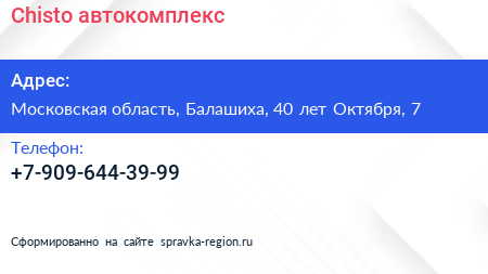 Chisto, автокомплекс по адресу Московская область, Балашиха, 40 лет Октября, 7 в дальнейшем Организация, размещена в следующих категориях: