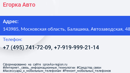 Егорка-Авто по адресу 143985, Московская область, Балашиха, Автозаводская, 48 в дальнейшем Организация, размещена в следующих категориях: