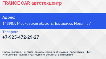 FRANCE CAR, автотехцентр по адресу 143987, Московская область, Балашиха, Новая, 57 в дальнейшем Организация, размещена в следующих категориях: