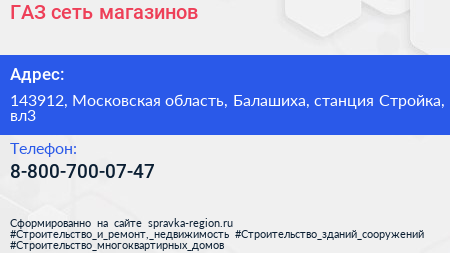 ГАЗ, сеть магазинов по адресу 143912, Московская область, Балашиха, станция Стройка, вл3 в дальнейшем Организация, размещена в следующих категориях: