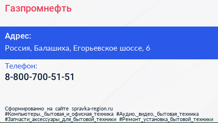 Газпромнефть по адресу Газпромнефть, Егорьевское шоссе, Новокрасково, посёлок КСЗ, Красково, городской округ Люберцы, Московская область, Центральный федеральный округ, 140050, Россия в дальнейшем Организация, размещена в следующих категориях: