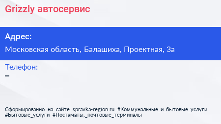 Grizzly, автосервис по адресу Московская область, Балашиха, Проектная, 3а в дальнейшем Организация, размещена в следующих категориях: