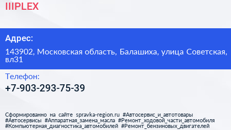 IIIPLEX по адресу 143902, Московская область, Балашиха, улица Советская, вл31 в дальнейшем Организация, размещена в следующих категориях: