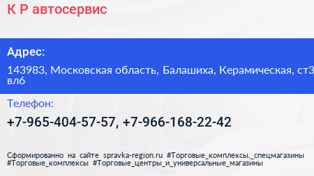 К.Р., автосервис по адресу 143983, Московская область, Балашиха, Керамическая, ст3 вл6 в дальнейшем Организация, размещена в следующих категориях: