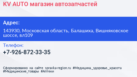 KV-AUTO, магазин автозапчастей по адресу 143930, Московская область, Балашиха, Вишняковское шоссе, вл109 в дальнейшем Организация, размещена в следующих категориях: