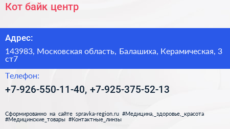Кот, байк-центр по адресу 143983, Московская область, Балашиха, Керамическая, 3 ст7 в дальнейшем Организация, размещена в следующих категориях: