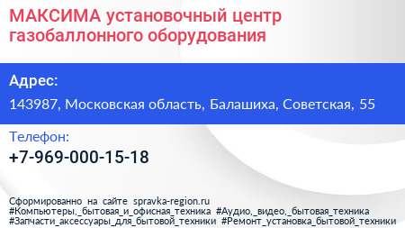 МАКСИМА, установочный центр газобаллонного оборудования по адресу 143987, Московская область, Балашиха, Советская, 55 в дальнейшем Организация, размещена в следующих категориях:
