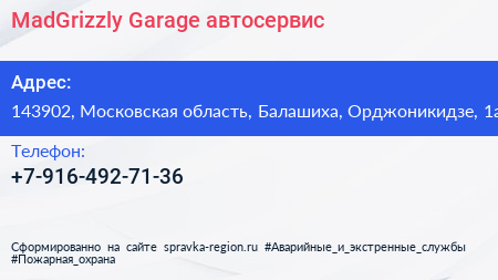 MadGrizzly Garage, автосервис по адресу 143902, Московская область, Балашиха, Орджоникидзе, 1а в дальнейшем Организация, размещена в следующих категориях: