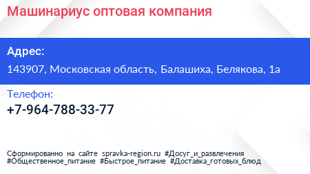Машинариус, оптовая компания по адресу 143907, Московская область, Балашиха, Белякова, 1а в дальнейшем Организация, размещена в следующих категориях: