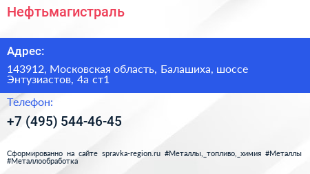 Нефтьмагистраль по адресу 143912, Московская область, Балашиха, шоссе Энтузиастов, 4а ст1 в дальнейшем Организация, размещена в следующих категориях: