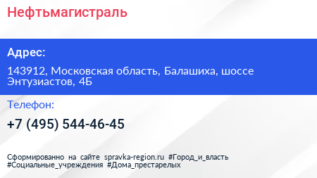 Нефтьмагистраль по адресу 143912, Московская область, Балашиха, шоссе Энтузиастов, 4Б в дальнейшем Организация, размещена в следующих категориях: