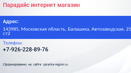 Парадайс, интернет-магазин по адресу 143985, Московская область, Балашиха, Автозаводская, 25 ст2 в дальнейшем Организация, размещена в следующих категориях:
