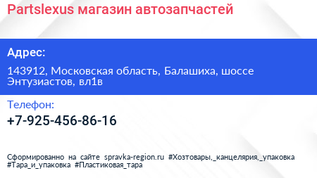Partslexus, магазин автозапчастей по адресу 143912, Московская область, Балашиха, шоссе Энтузиастов, вл1в в дальнейшем Организация, размещена в следующих категориях: