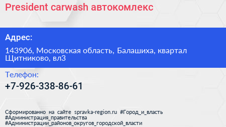 President carwash, автокомлекс по адресу 143906, Московская область, Балашиха, квартал Щитниково, вл3 в дальнейшем Организация, размещена в следующих категориях: