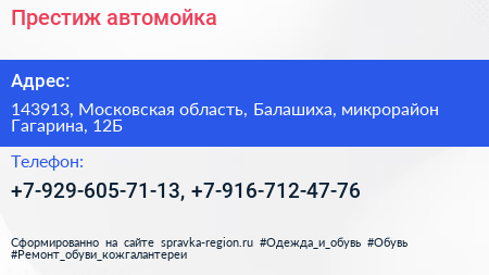 Престиж, автомойка по адресу 143913, Московская область, Балашиха, микрорайон Гагарина, 12Б в дальнейшем Организация, размещена в следующих категориях: